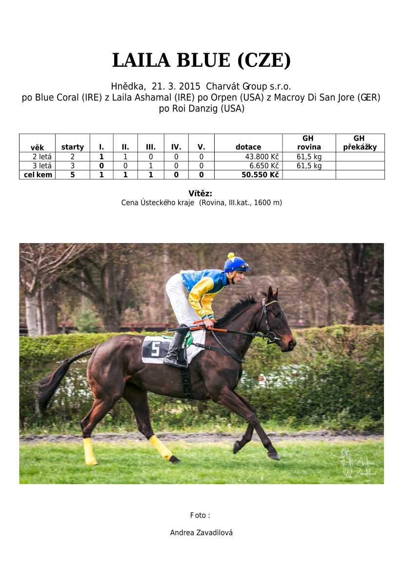 Důvěru v chovu ji dal Ing. Karol Szabo a jak jde vidět neprohloupil. Ze čtyř startujících potomků dala 3x Nejlepšího koně slovenského chovu. 2019 BOLTHORN (Mikhail Glinka), 2022 BLUE BAY (Shamalgan) a 2023 BLUE RIVER (Fairlypi).
