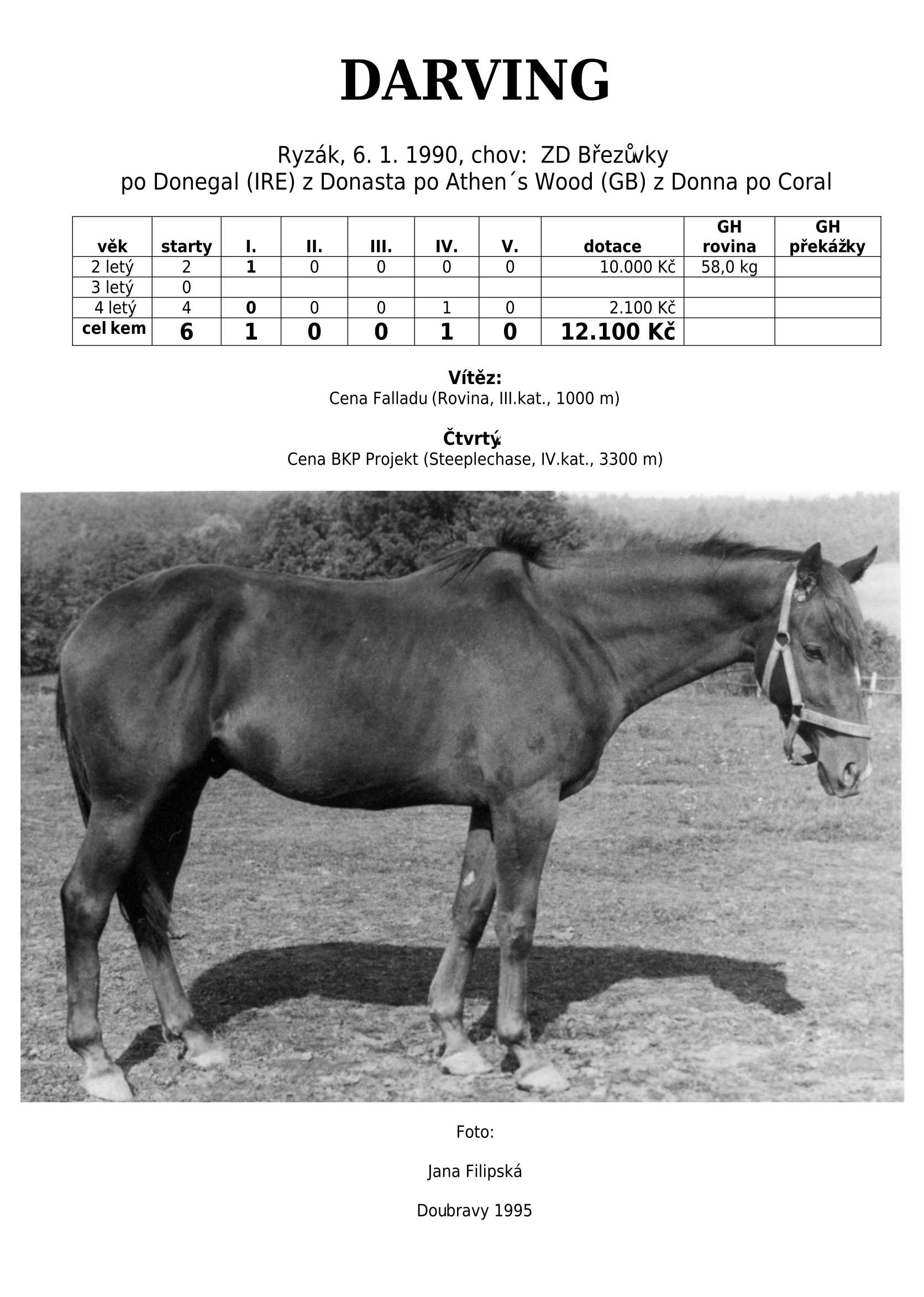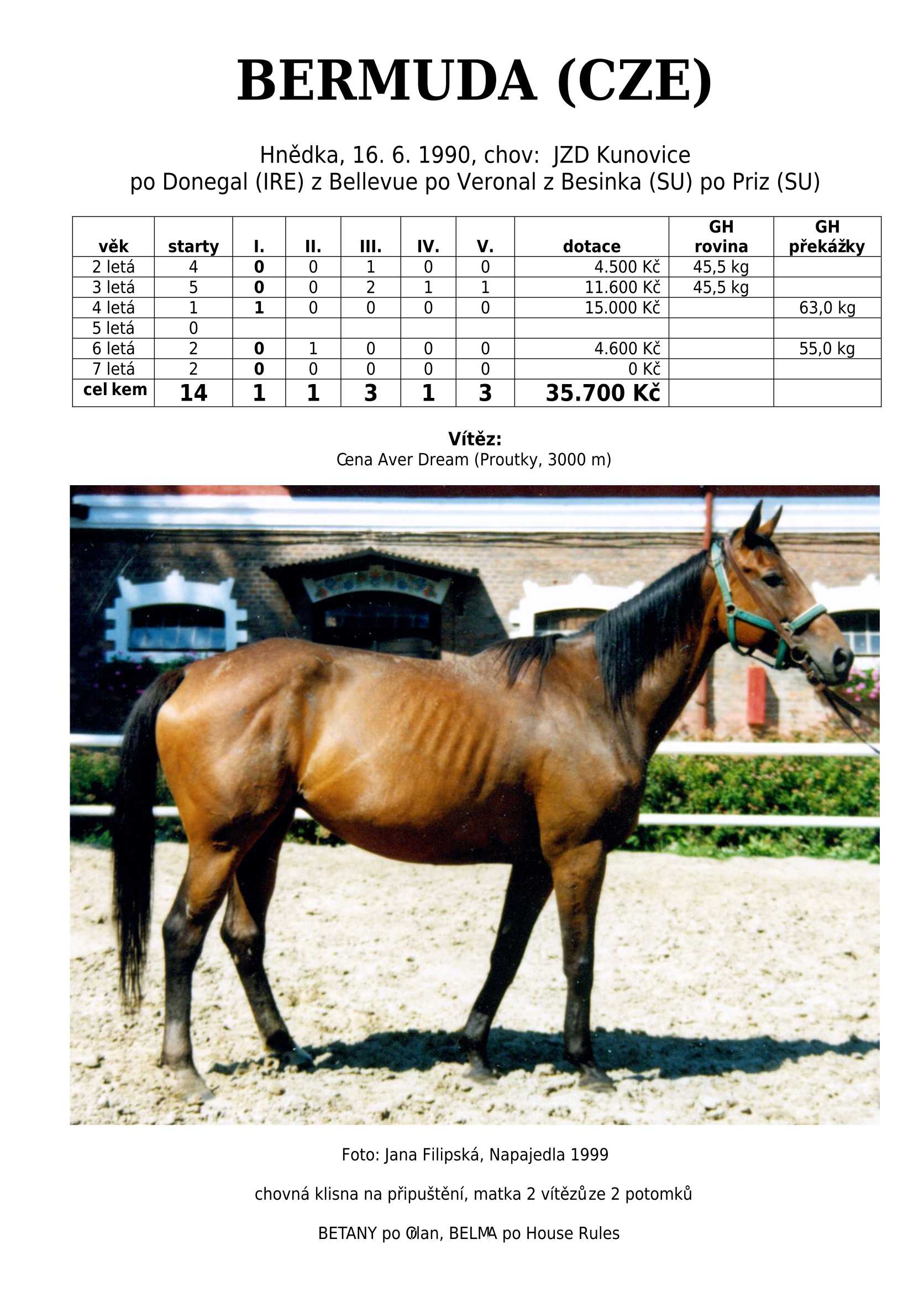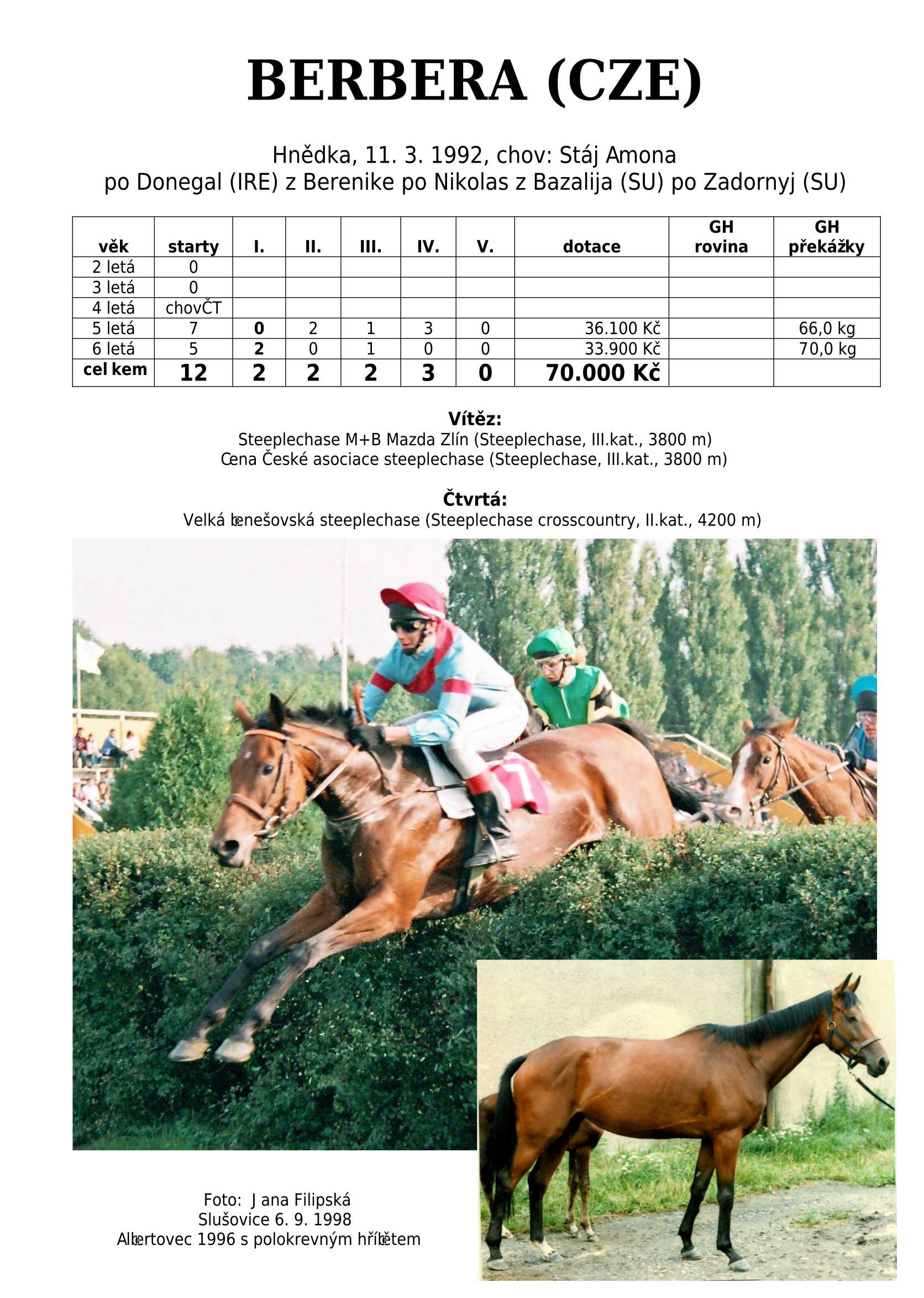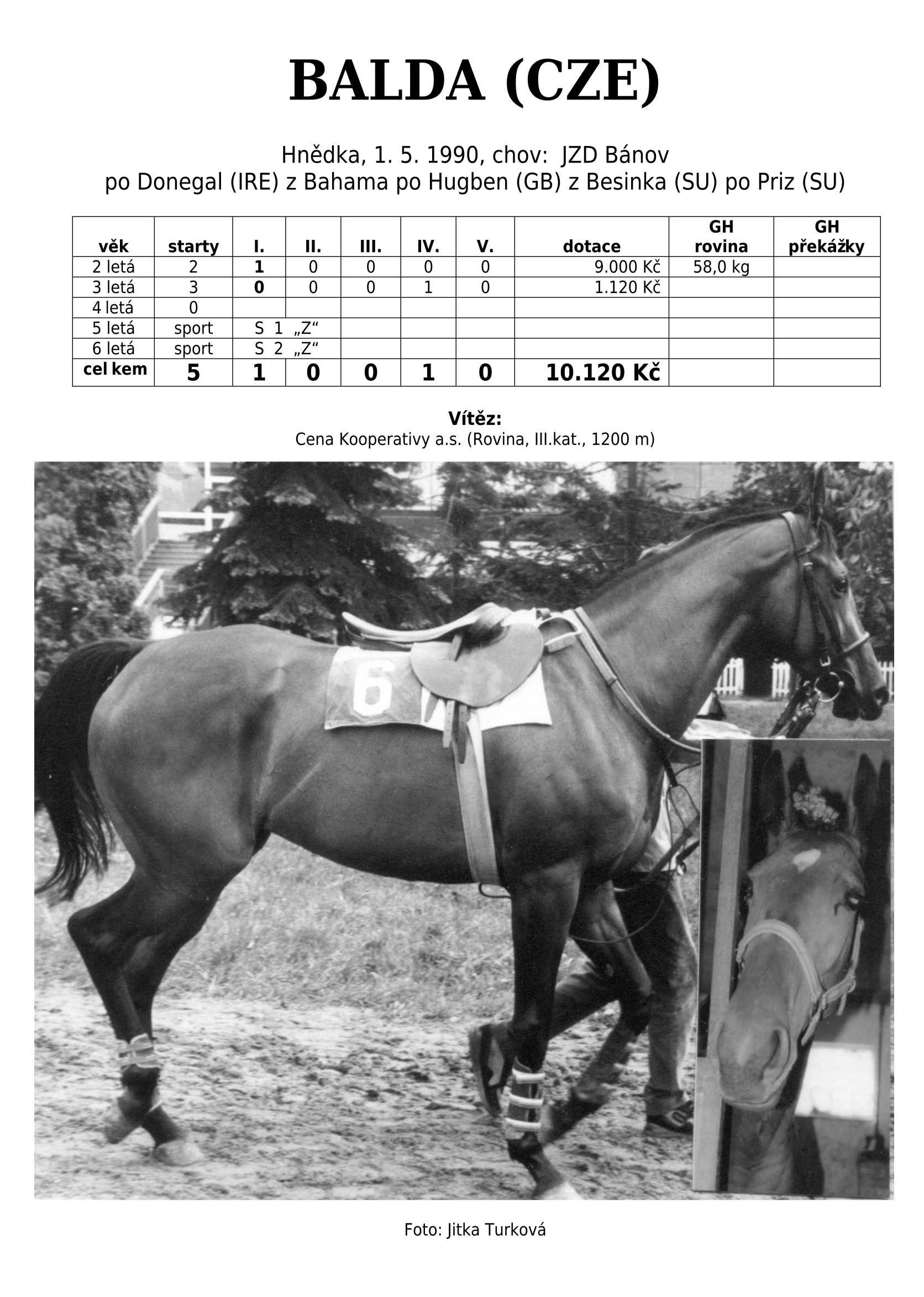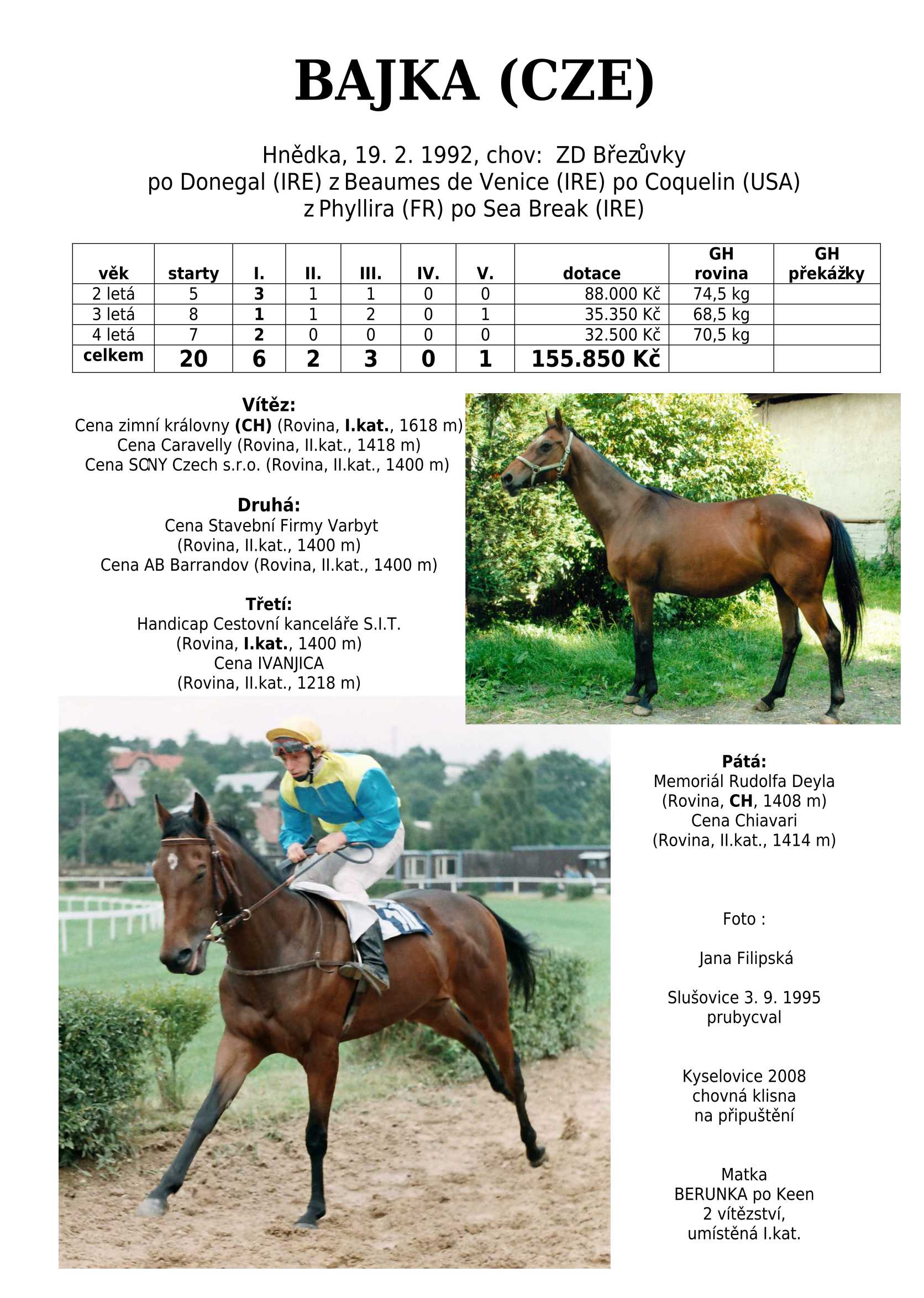 Hnědka BATHORY (IRE) (Celtic Swing) na dráze startovala 3-4 letá celkem 8x. Získala 2 vítězství, ale největším úspěchem bylo druhé místo v Cene Whisky (I.kat). Žádná super hvězda, ale ani se zcela neztratila.