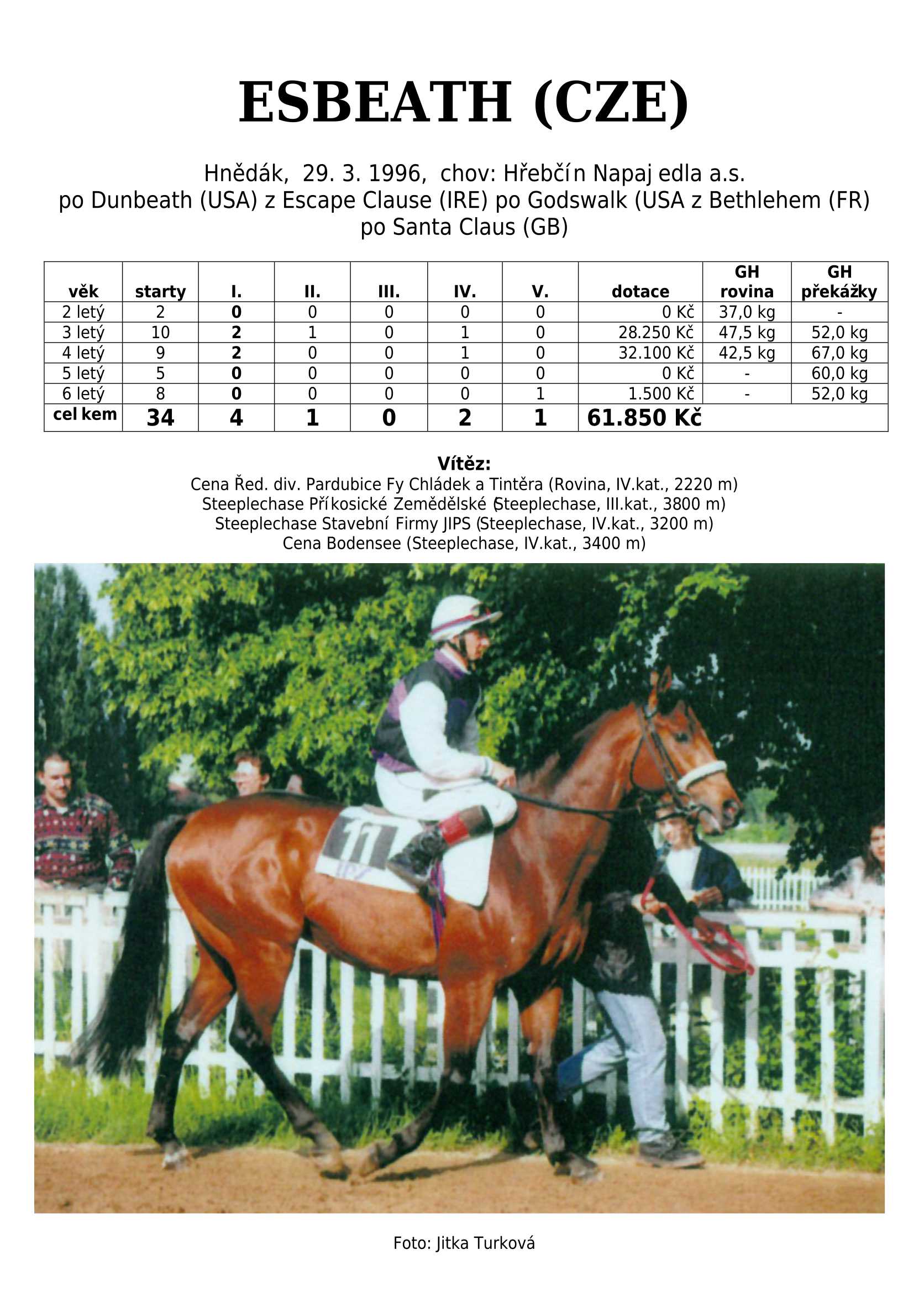 Hnědka BATHORY (IRE) (Celtic Swing) na dráze startovala 3-4 letá celkem 8x. Získala 2 vítězství, ale největším úspěchem bylo druhé místo v Cene Whisky (I.kat). Žádná super hvězda, ale ani se zcela neztratila.
