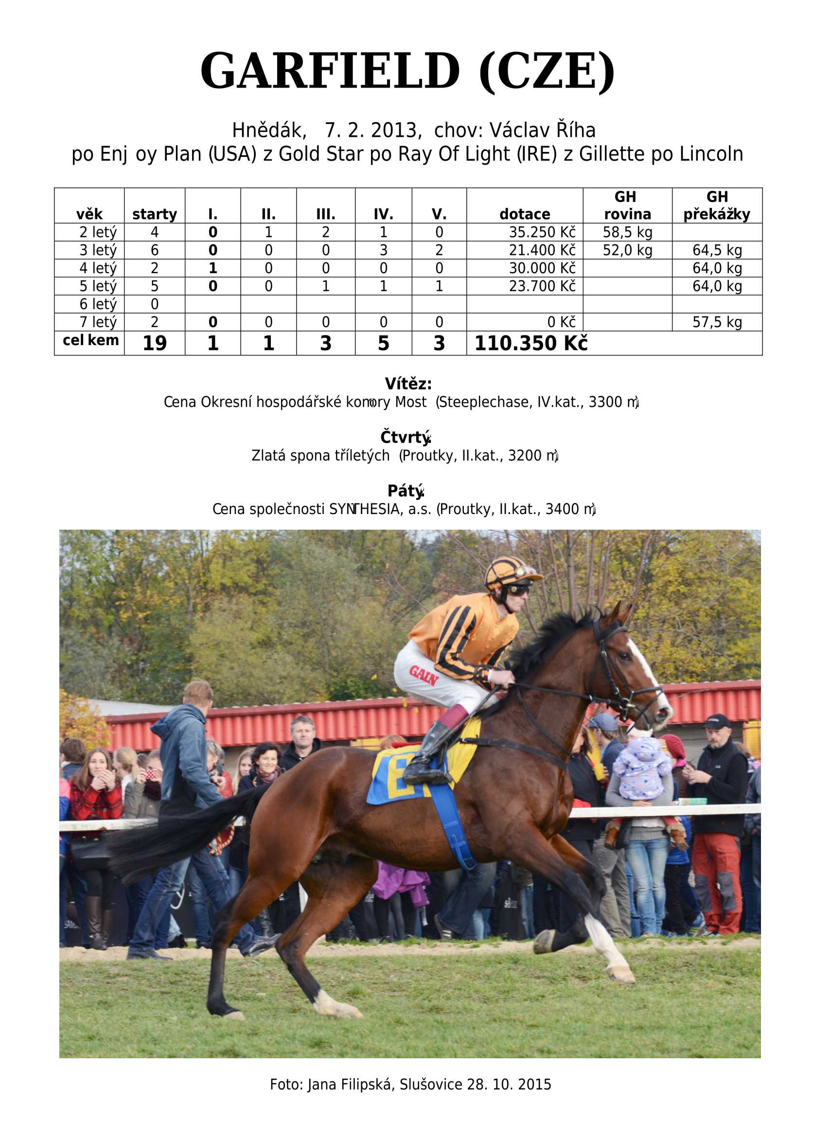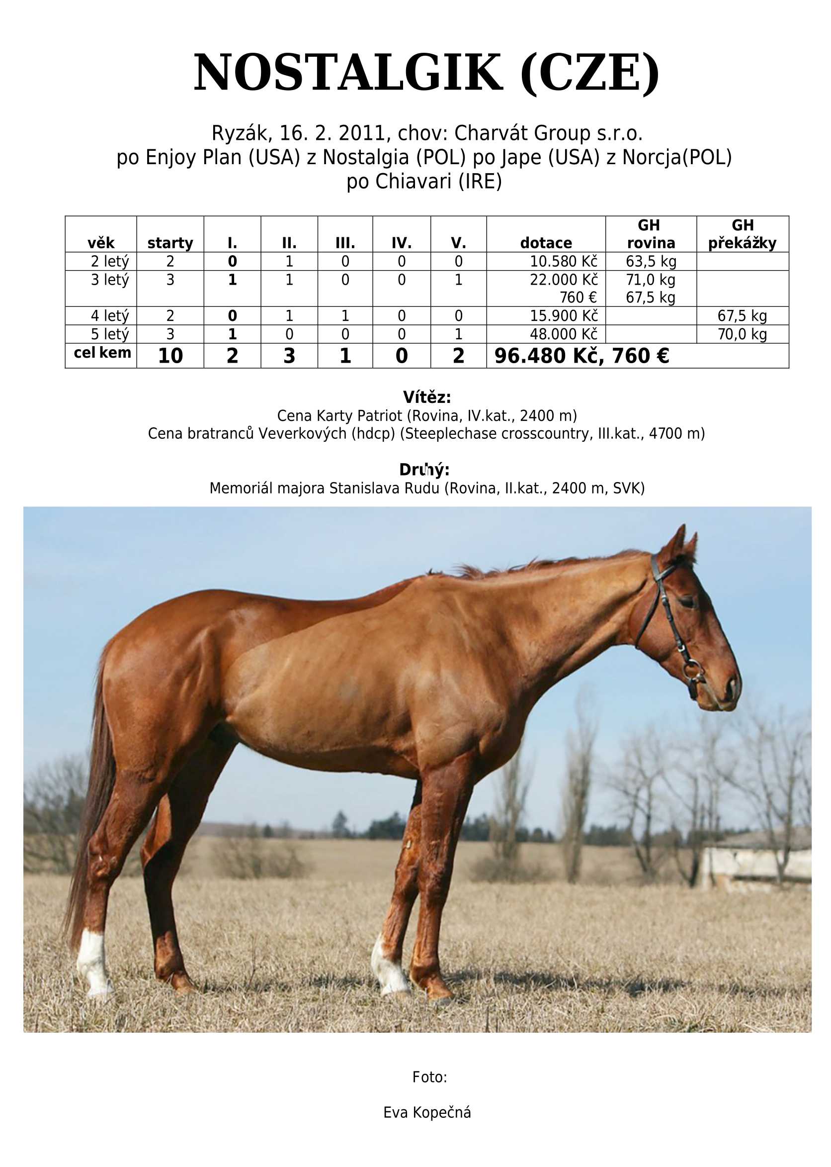 Ke konci dostihové sezóny jsem se pustila do aktualizace výsledků vítězných potomků. Každý plemeník bude mít své potomky na hlavní stránce, bez dalšího vyhledávání a klikání. Vše bude přehlednější, ale aktualizace bude z časových důvodů postupná. Přidáváni jsou potomci s ukončenou dostihovou kariérou.