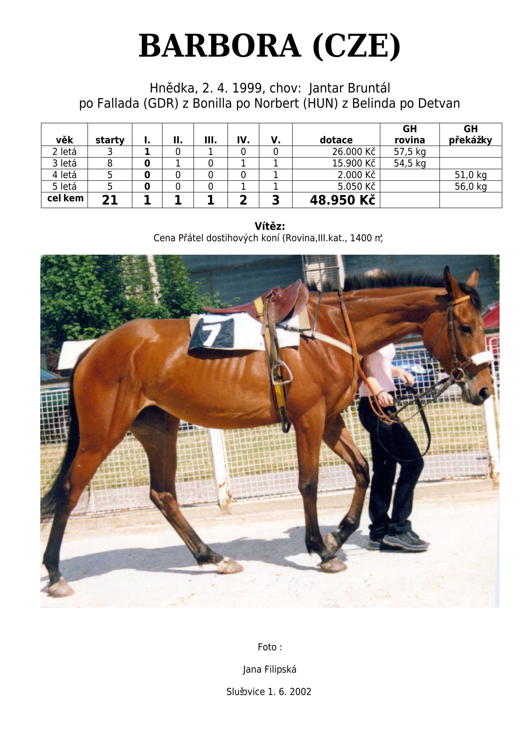Hnědka BATHORY (IRE) (Celtic Swing) na dráze startovala 3-4 letá celkem 8x. Získala 2 vítězství, ale největším úspěchem bylo druhé místo v Cene Whisky (I.kat). Žádná super hvězda, ale ani se zcela neztratila.