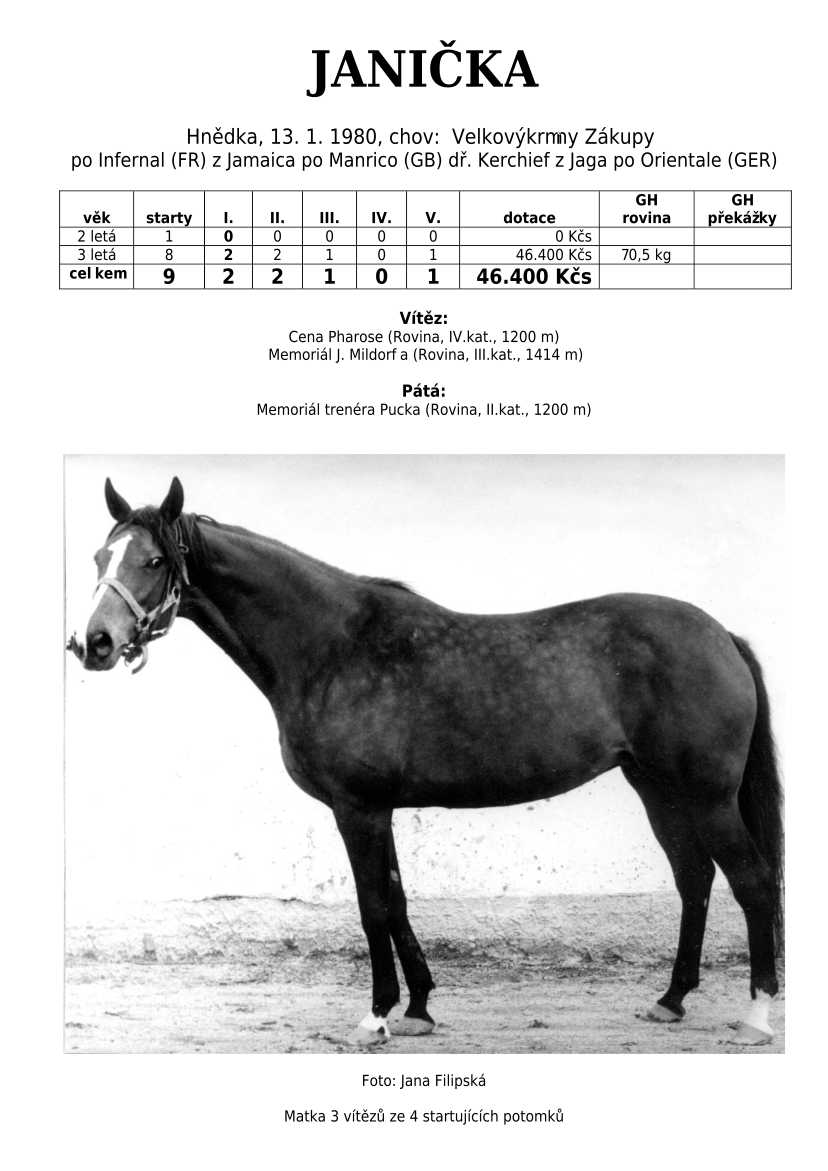 Ke konci dostihové sezóny jsem se pustila do aktualizace výsledků vítězných potomků. Každý plemeník bude mít své potomky na hlavní stránce, bez dalšího vyhledávání a klikání. Vše bude přehlednější, ale aktualizace bude z časových důvodů postupná. Přidáváni jsou potomci s ukončenou dostihovou kariérou.