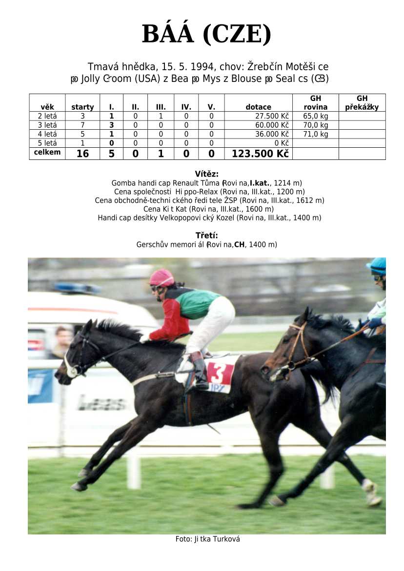 Hnědka BATHORY (IRE) (Celtic Swing) na dráze startovala 3-4 letá celkem 8x. Získala 2 vítězství, ale největším úspěchem bylo druhé místo v Cene Whisky (I.kat). Žádná super hvězda, ale ani se zcela neztratila.