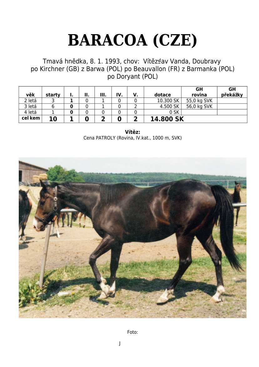 Hnědka BATHORY (IRE) (Celtic Swing) na dráze startovala 3-4 letá celkem 8x. Získala 2 vítězství, ale největším úspěchem bylo druhé místo v Cene Whisky (I.kat). Žádná super hvězda, ale ani se zcela neztratila.