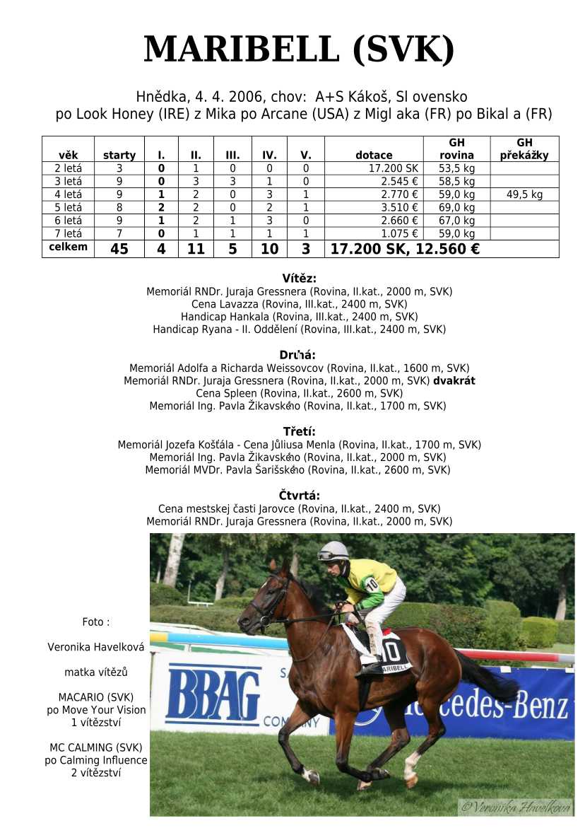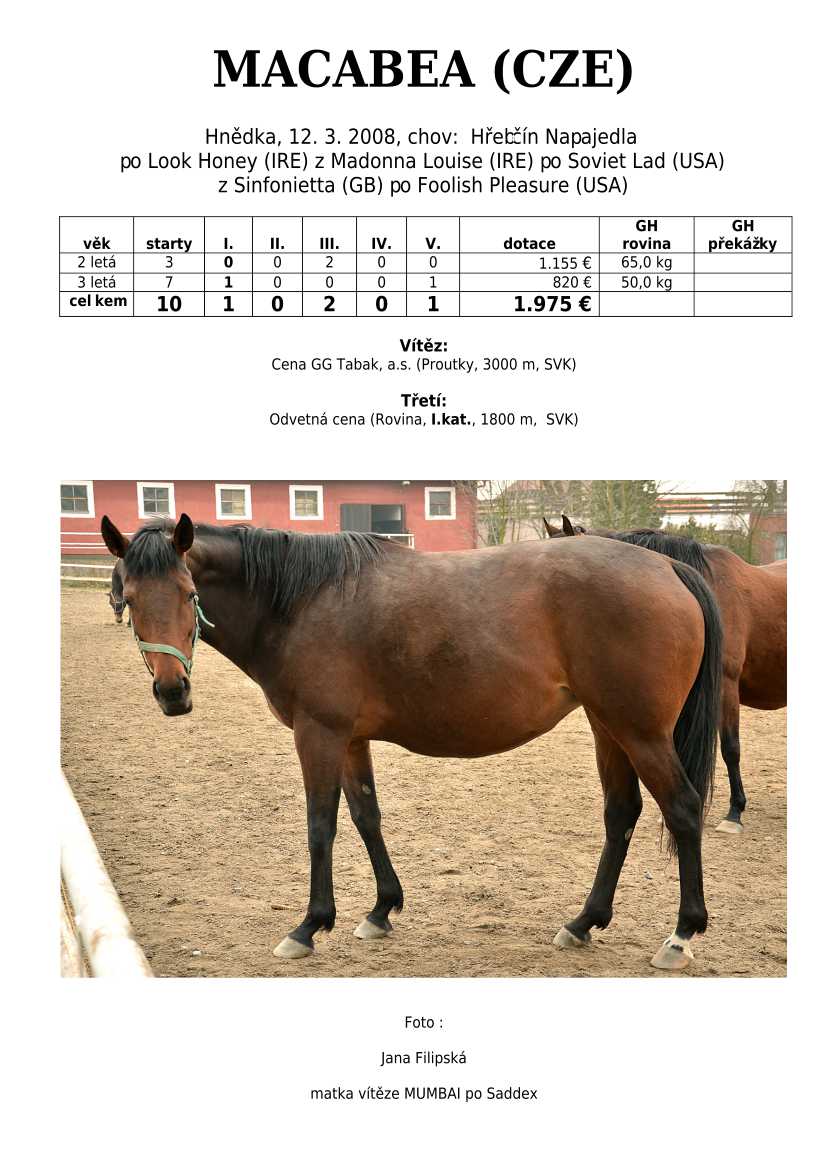 Hnědka BATHORY (IRE) (Celtic Swing) na dráze startovala 3-4 letá celkem 8x. Získala 2 vítězství, ale největším úspěchem bylo druhé místo v Cene Whisky (I.kat). Žádná super hvězda, ale ani se zcela neztratila.