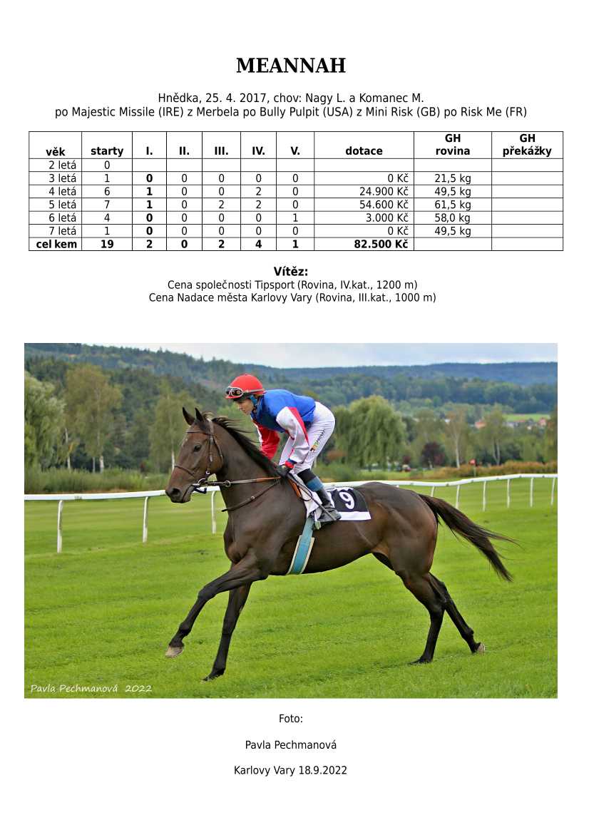 Důvěru v chovu ji dal Ing. Karol Szabo a jak jde vidět neprohloupil. Ze čtyř startujících potomků dala 3x Nejlepšího koně slovenského chovu. 2019 BOLTHORN (Mikhail Glinka), 2022 BLUE BAY (Shamalgan) a 2023 BLUE RIVER (Fairlypi).