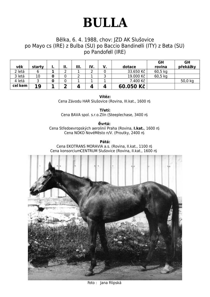 Hnědka BATHORY (IRE) (Celtic Swing) na dráze startovala 3-4 letá celkem 8x. Získala 2 vítězství, ale největším úspěchem bylo druhé místo v Cene Whisky (I.kat). Žádná super hvězda, ale ani se zcela neztratila.