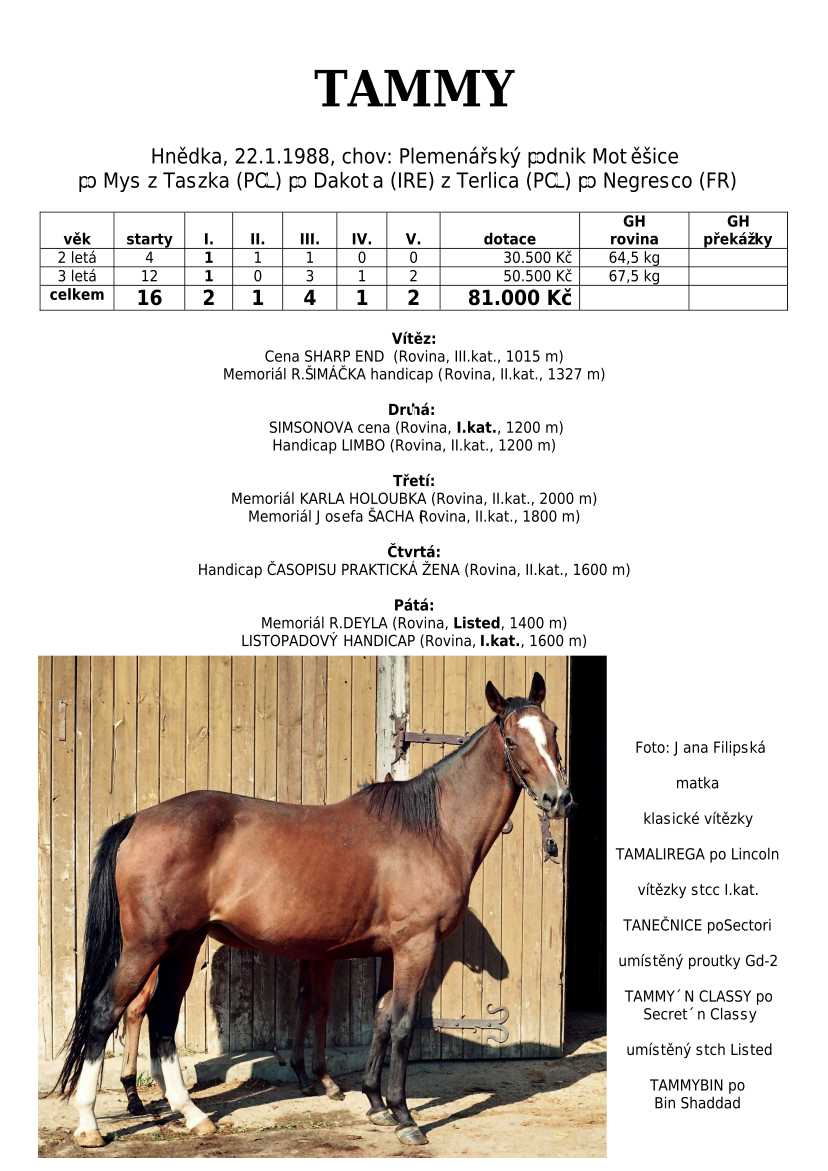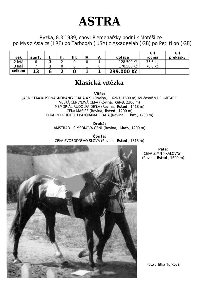 Ke konci dostihové sezóny jsem se pustila do aktualizace výsledků vítězných potomků. Každý plemeník bude mít své potomky na hlavní stránce, bez dalšího vyhledávání a klikání. Vše bude přehlednější, ale aktualizace bude z časových důvodů postupná. Přidáváni jsou potomci s ukončenou dostihovou kariérou.