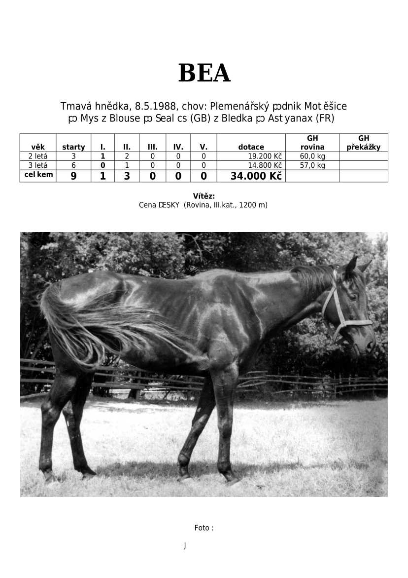 Hnědka BATHORY (IRE) (Celtic Swing) na dráze startovala 3-4 letá celkem 8x. Získala 2 vítězství, ale největším úspěchem bylo druhé místo v Cene Whisky (I.kat). Žádná super hvězda, ale ani se zcela neztratila.
