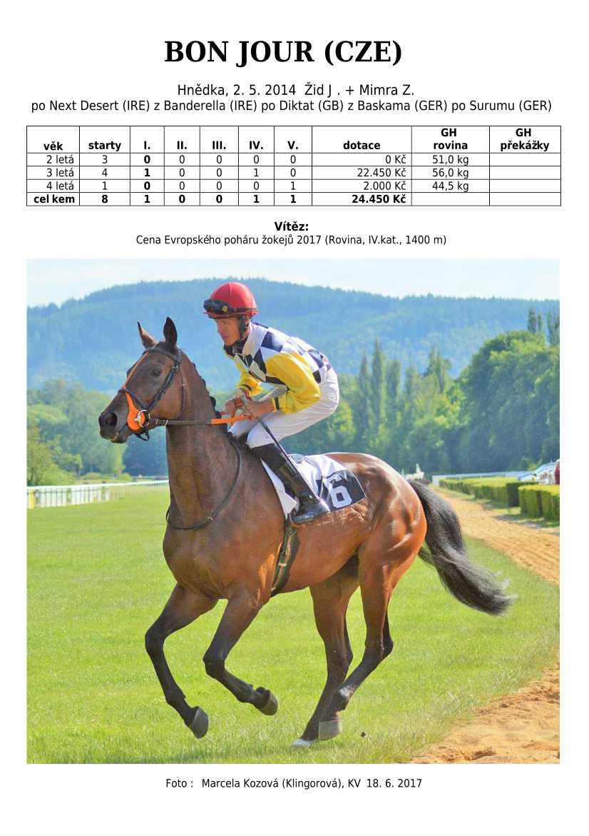 Hnědka BATHORY (IRE) (Celtic Swing) na dráze startovala 3-4 letá celkem 8x. Získala 2 vítězství, ale největším úspěchem bylo druhé místo v Cene Whisky (I.kat). Žádná super hvězda, ale ani se zcela neztratila.