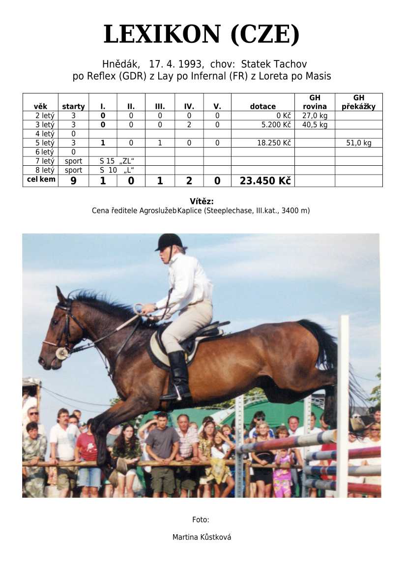 Ke konci dostihové sezóny jsem se pustila do aktualizace výsledků vítězných potomků. Každý plemeník bude mít své potomky na hlavní stránce, bez dalšího vyhledávání a klikání. Vše bude přehlednější, ale aktualizace bude z časových důvodů postupná. Přidáváni jsou potomci s ukončenou dostihovou kariérou.