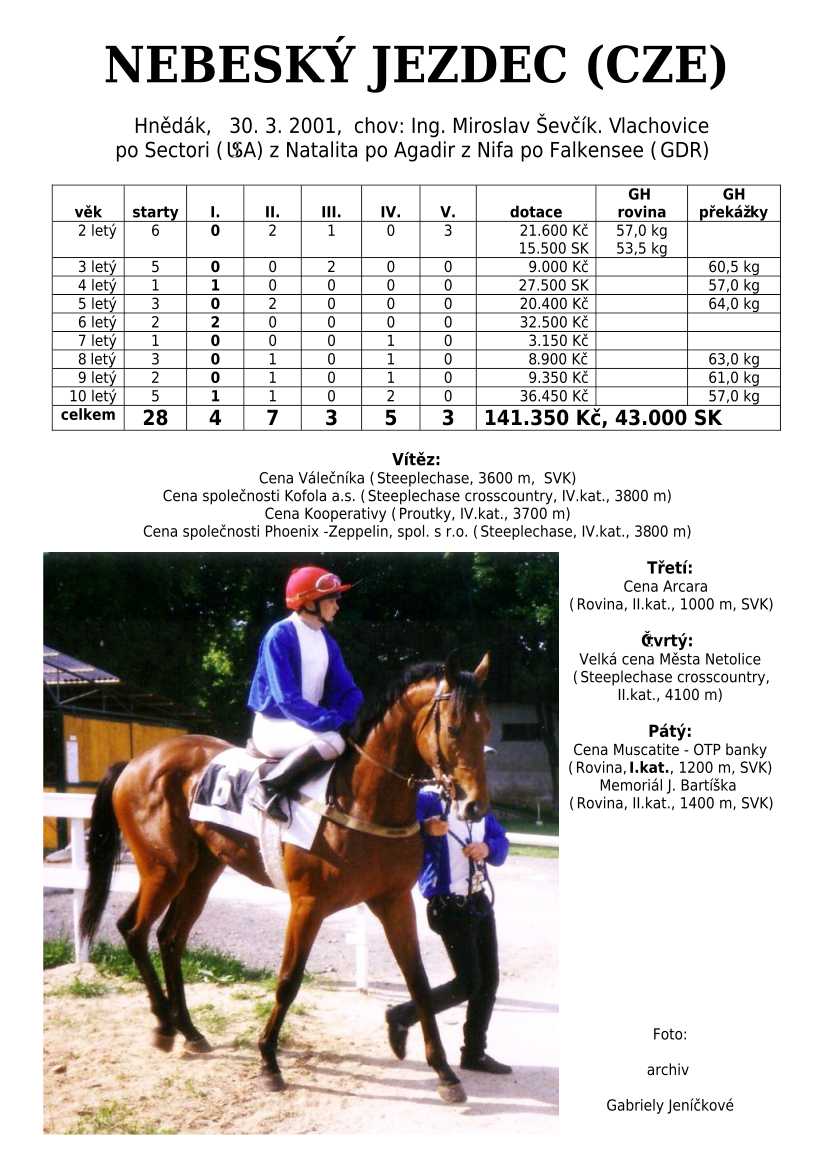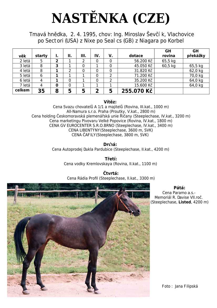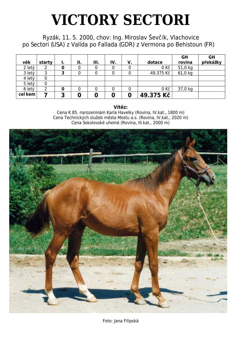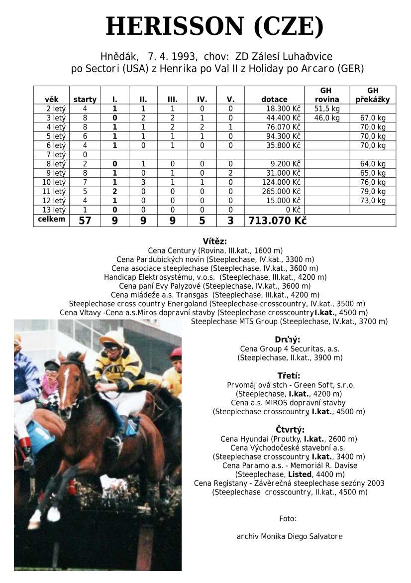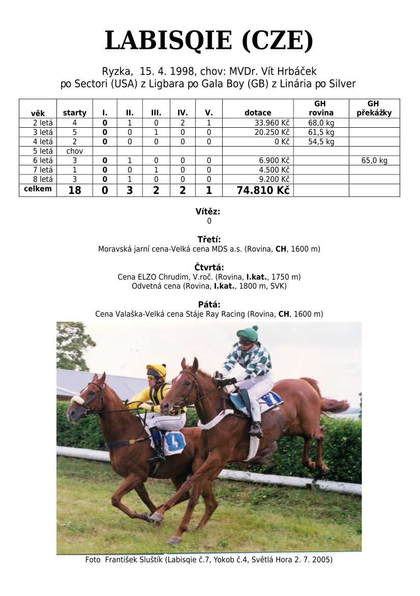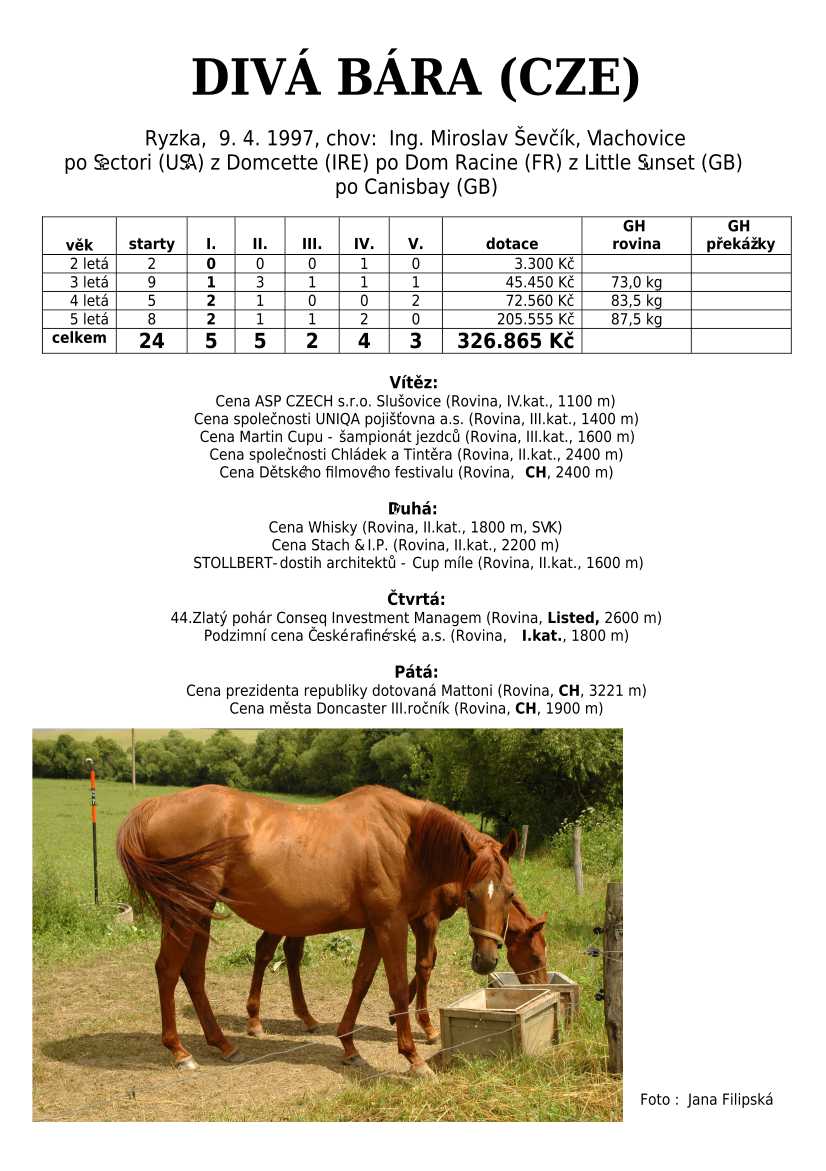 Ke konci dostihové sezóny jsem se pustila do aktualizace výsledků vítězných potomků. Každý plemeník bude mít své potomky na hlavní stránce, bez dalšího vyhledávání a klikání. Vše bude přehlednější, ale aktualizace bude z časových důvodů postupná. Přidáváni jsou potomci s ukončenou dostihovou kariérou.