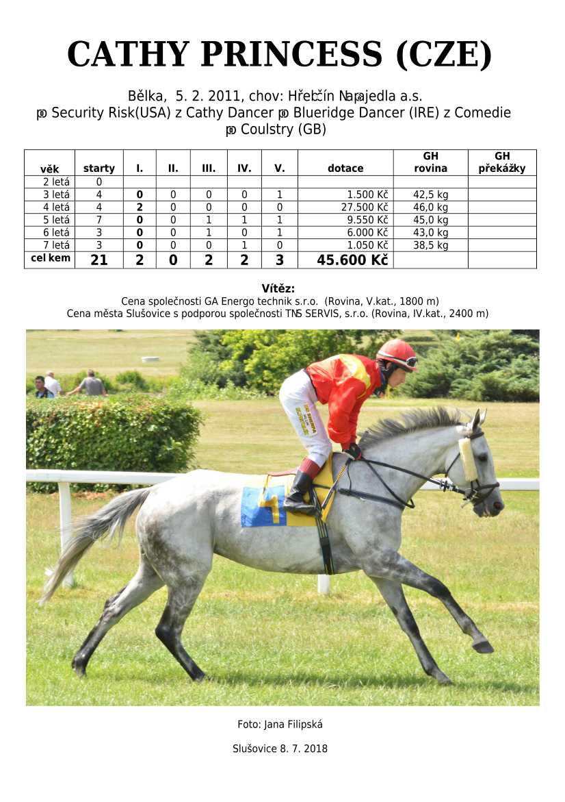 Hnědka BATHORY (IRE) (Celtic Swing) na dráze startovala 3-4 letá celkem 8x. Získala 2 vítězství, ale největším úspěchem bylo druhé místo v Cene Whisky (I.kat). Žádná super hvězda, ale ani se zcela neztratila.
