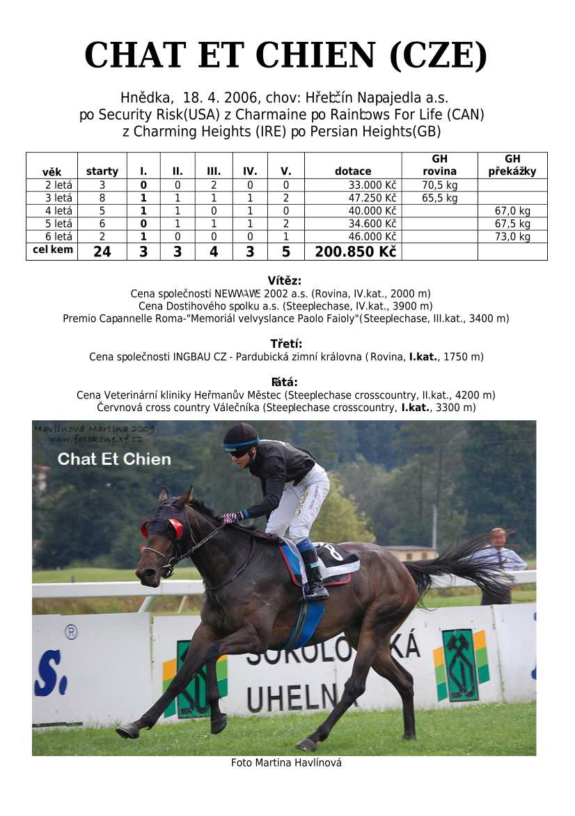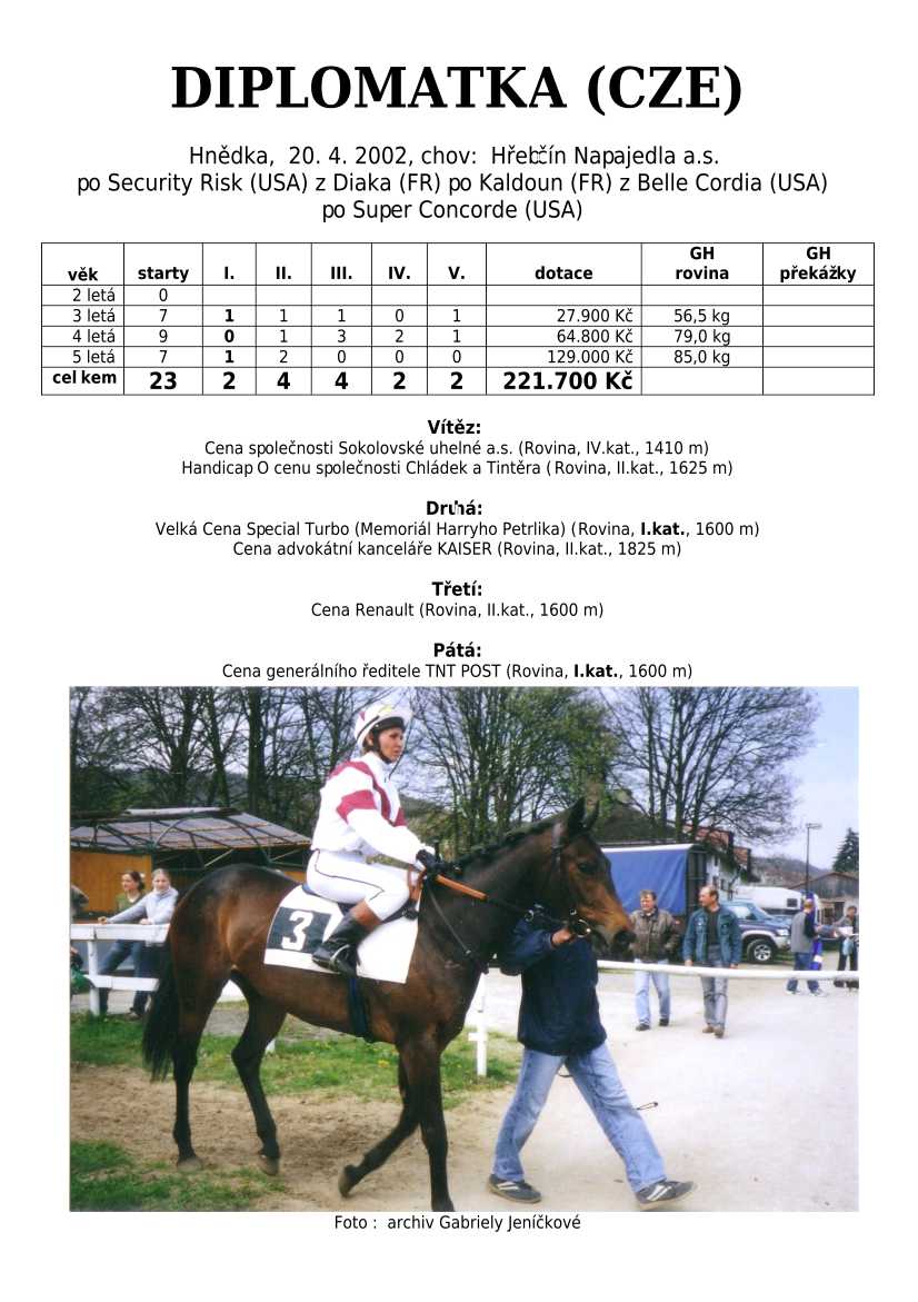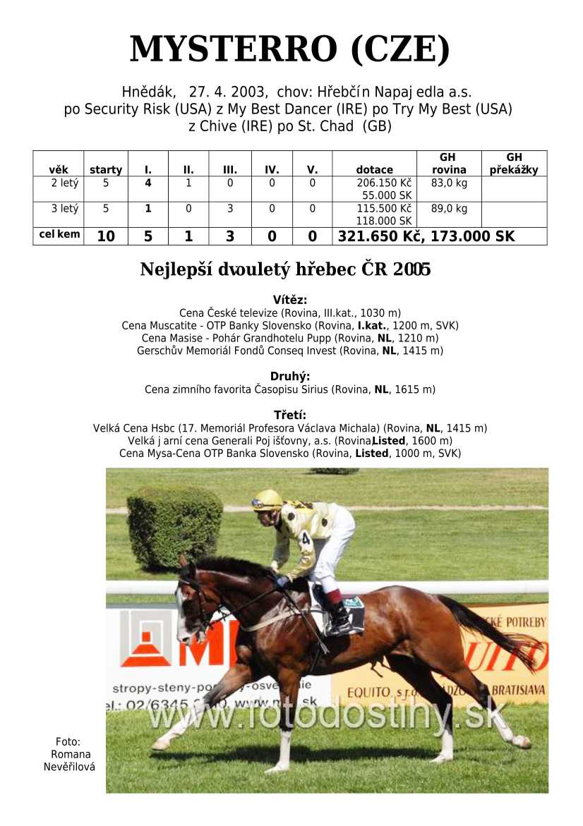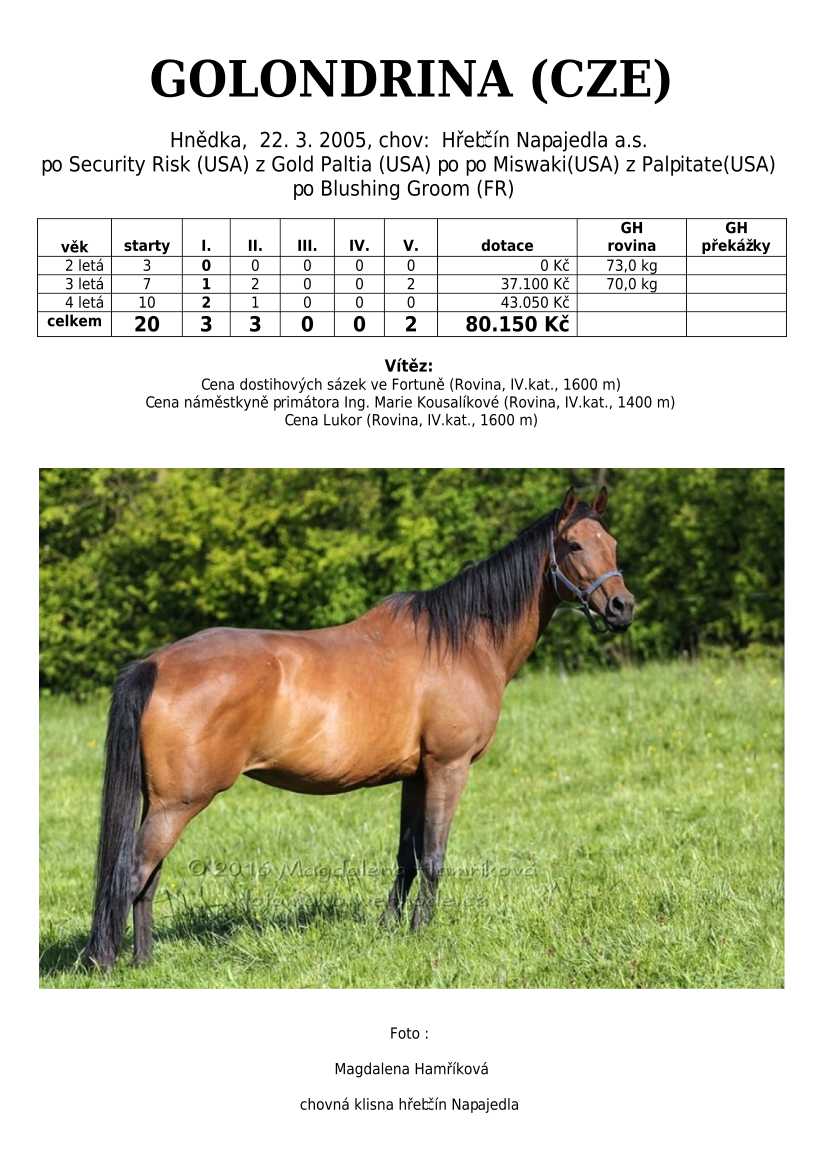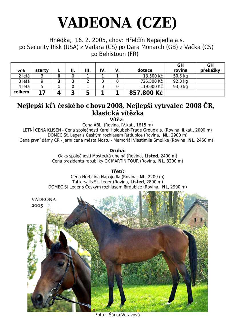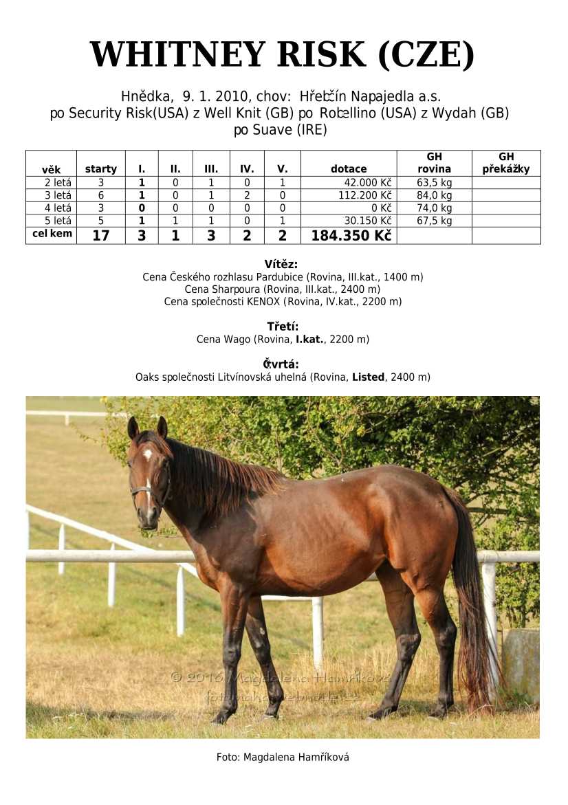 Ke konci dostihové sezóny jsem se pustila do aktualizace výsledků vítězných potomků. Každý plemeník bude mít své potomky na hlavní stránce, bez dalšího vyhledávání a klikání. Vše bude přehlednější, ale aktualizace bude z časových důvodů postupná. Přidáváni jsou potomci s ukončenou dostihovou kariérou.