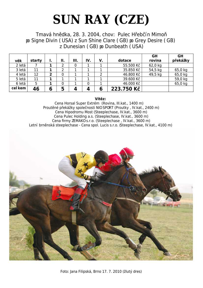 Bezpochyby největší zásluhu na titulu má náš nejvěhlasnější překážkový dostih Velká pardubická steeplechase. Letošní ročník se do historie zapsal zcela nezapomenutelně. Především to byl fantastický doběh dvou koní současně. Sice chyběla cílová fotografie, ale mě strhující výkon obou koní, po 6900 m dlouhé trati, vzal dech a dostihová komise nemohla rozhodnout o vítězství lépe. Poctivý SEXY LORD (Egerton) a jako z praku vystřelený do posledních metrů polokrevný GODFREY(FR)(Great Pretender). Přispěním do šampionátu byla i pátá příčka matadora TALENTa (Egerton). Pár bodíků přidali i umístění v rámcový dostizích ASKERANA (Egerton) a CLAUDIO (Egerton).