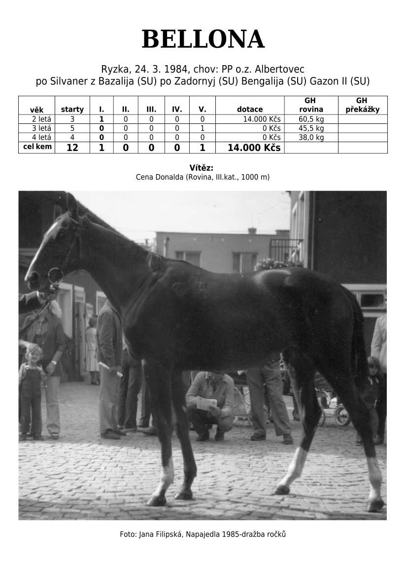 Hnědka BATHORY (IRE) (Celtic Swing) na dráze startovala 3-4 letá celkem 8x. Získala 2 vítězství, ale největším úspěchem bylo druhé místo v Cene Whisky (I.kat). Žádná super hvězda, ale ani se zcela neztratila.
