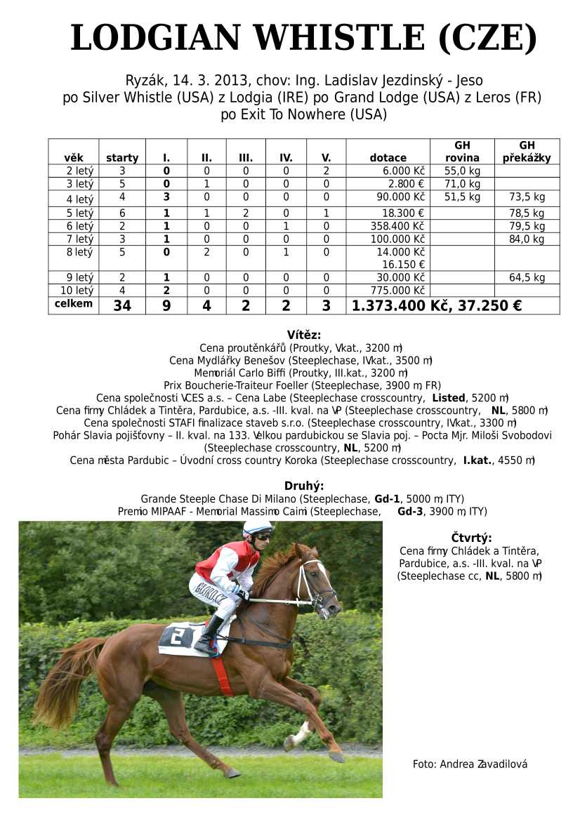 Bezpochyby největší zásluhu na titulu má náš nejvěhlasnější překážkový dostih Velká pardubická steeplechase. Letošní ročník se do historie zapsal zcela nezapomenutelně. Především to byl fantastický doběh dvou koní současně. Sice chyběla cílová fotografie, ale mě strhující výkon obou koní, po 6900 m dlouhé trati, vzal dech a dostihová komise nemohla rozhodnout o vítězství lépe. Poctivý SEXY LORD (Egerton) a jako z praku vystřelený do posledních metrů polokrevný GODFREY(FR)(Great Pretender). Přispěním do šampionátu byla i pátá příčka matadora TALENTa (Egerton). Pár bodíků přidali i umístění v rámcový dostizích ASKERANA (Egerton) a CLAUDIO (Egerton).