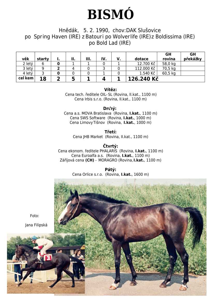 Hnědka BATHORY (IRE) (Celtic Swing) na dráze startovala 3-4 letá celkem 8x. Získala 2 vítězství, ale největším úspěchem bylo druhé místo v Cene Whisky (I.kat). Žádná super hvězda, ale ani se zcela neztratila.