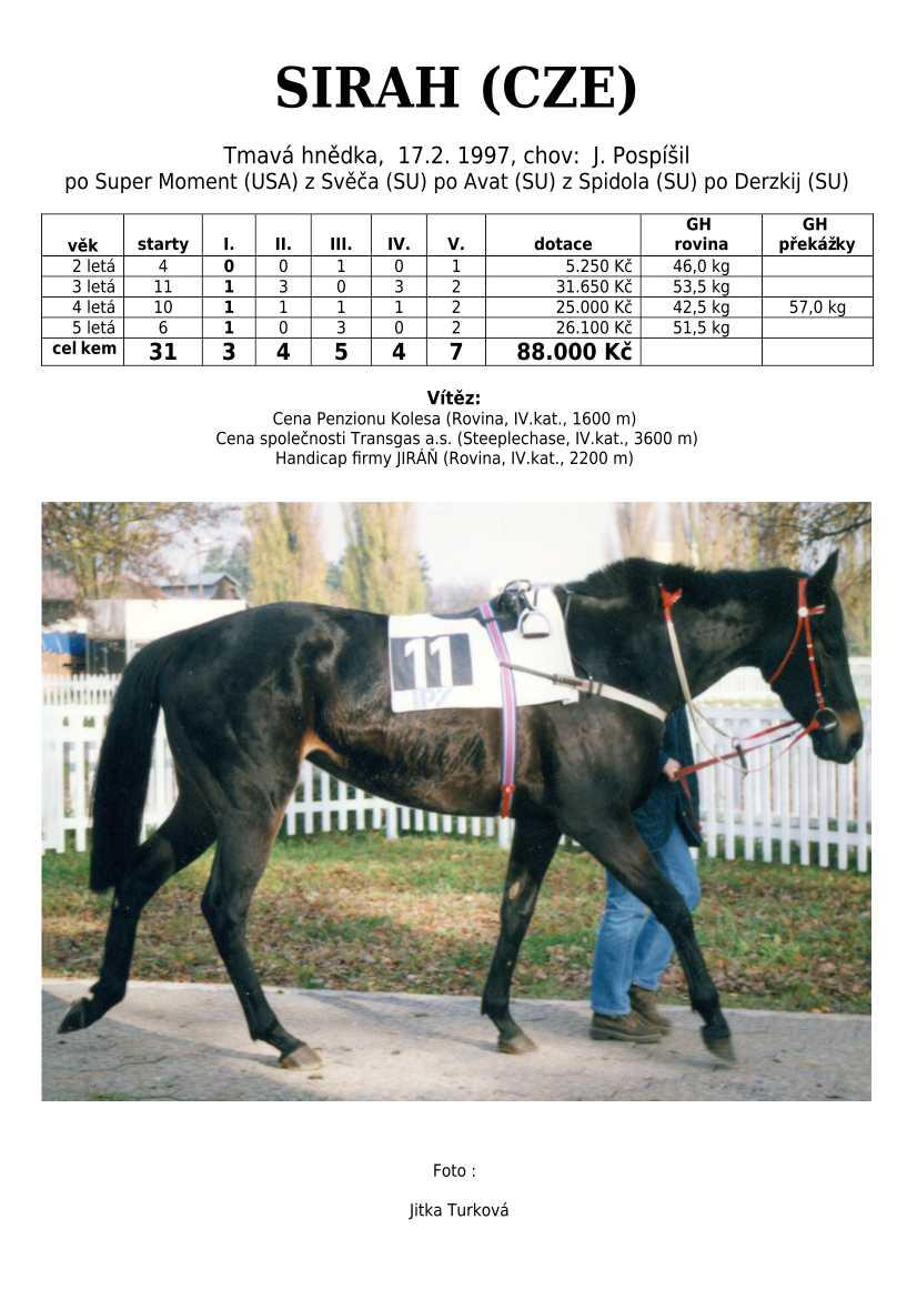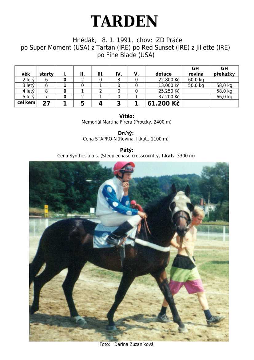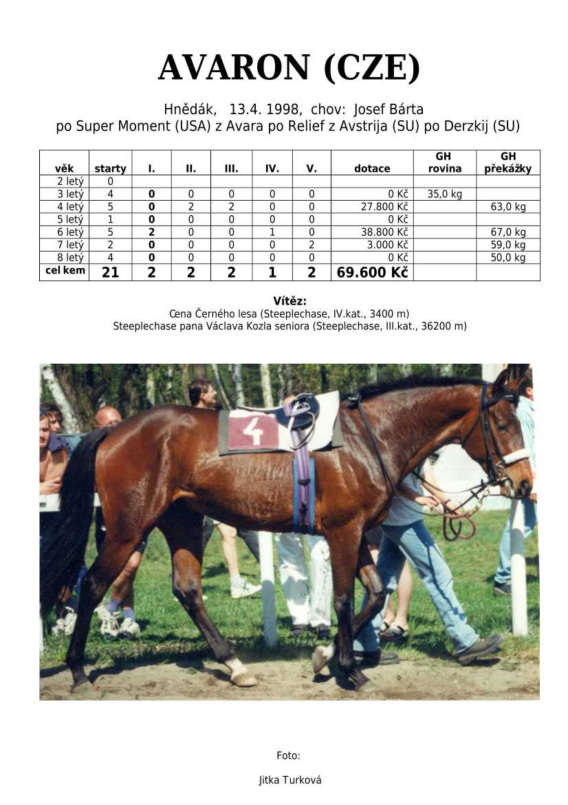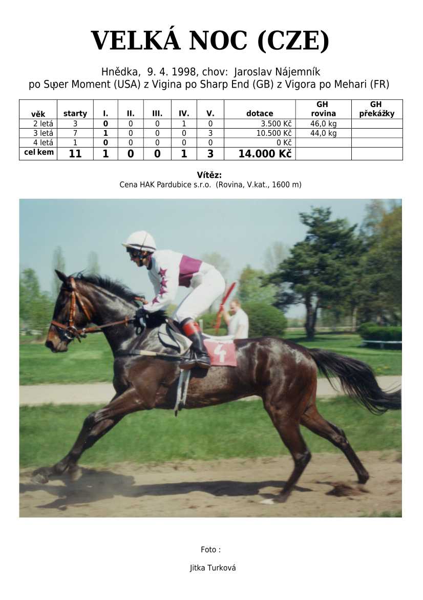Bezpochyby největší zásluhu na titulu má náš nejvěhlasnější překážkový dostih Velká pardubická steeplechase. Letošní ročník se do historie zapsal zcela nezapomenutelně. Především to byl fantastický doběh dvou koní současně. Sice chyběla cílová fotografie, ale mě strhující výkon obou koní, po 6900 m dlouhé trati, vzal dech a dostihová komise nemohla rozhodnout o vítězství lépe. Poctivý SEXY LORD (Egerton) a jako z praku vystřelený do posledních metrů polokrevný GODFREY(FR)(Great Pretender). Přispěním do šampionátu byla i pátá příčka matadora TALENTa (Egerton). Pár bodíků přidali i umístění v rámcový dostizích ASKERANA (Egerton) a CLAUDIO (Egerton).