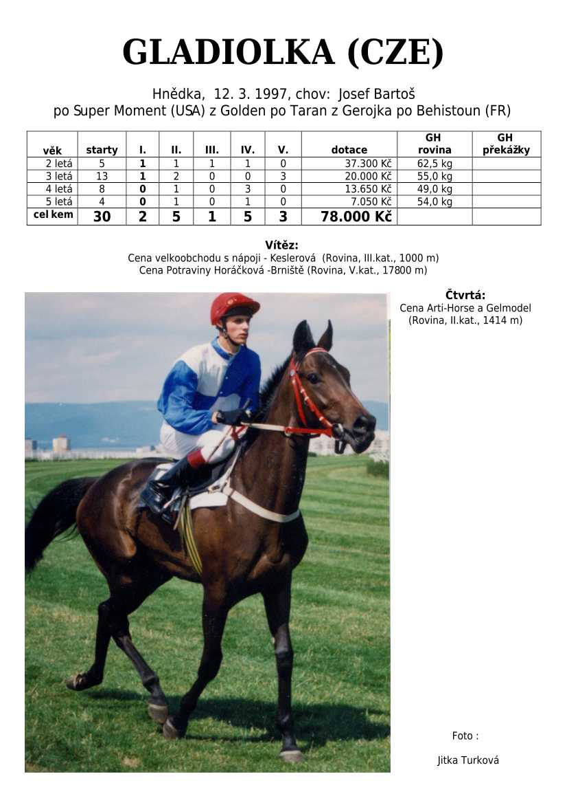 Hnědka BATHORY (IRE) (Celtic Swing) na dráze startovala 3-4 letá celkem 8x. Získala 2 vítězství, ale největším úspěchem bylo druhé místo v Cene Whisky (I.kat). Žádná super hvězda, ale ani se zcela neztratila.