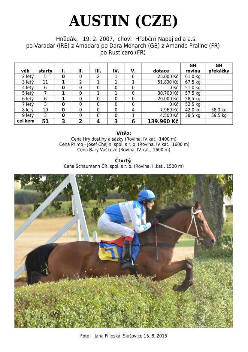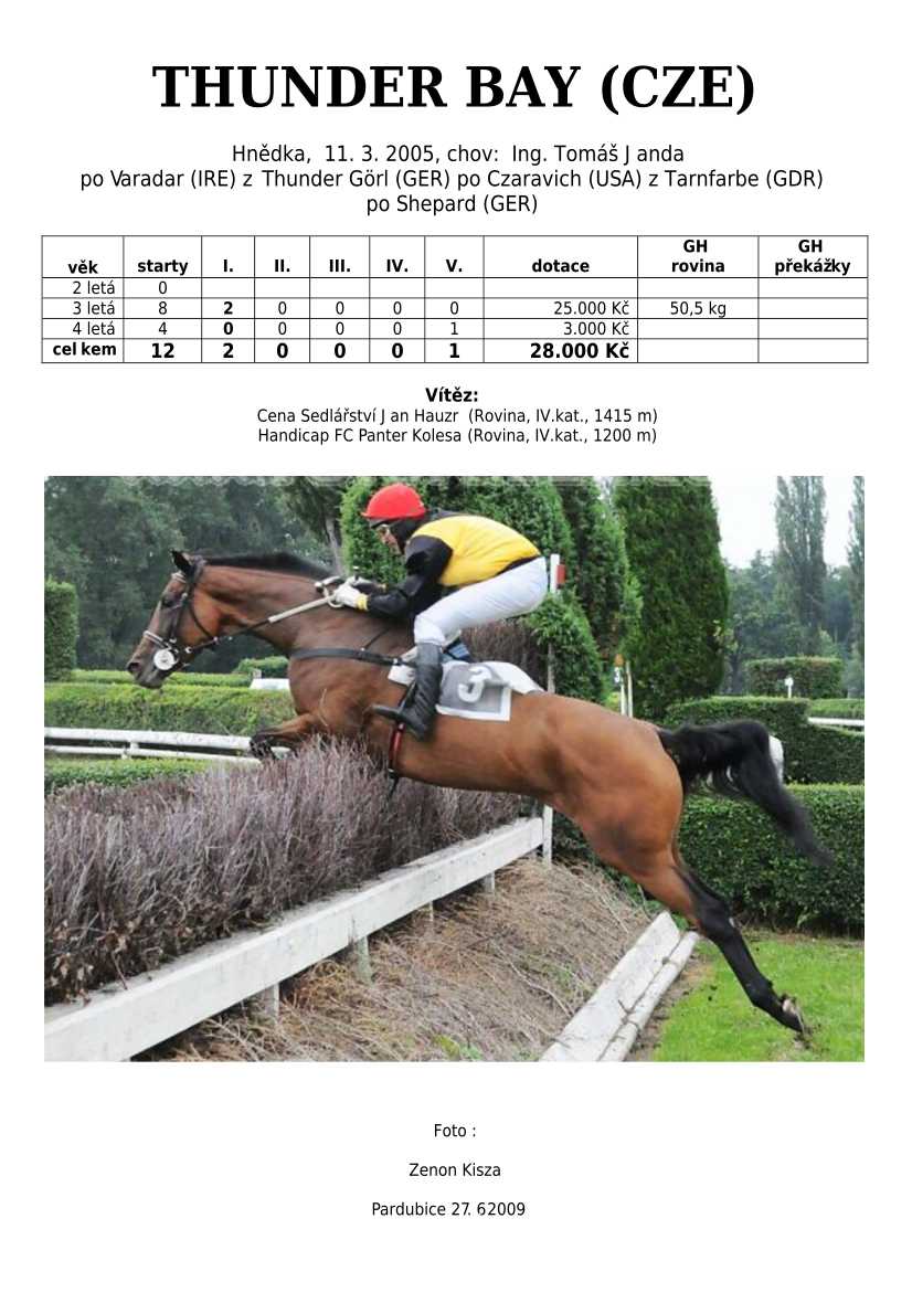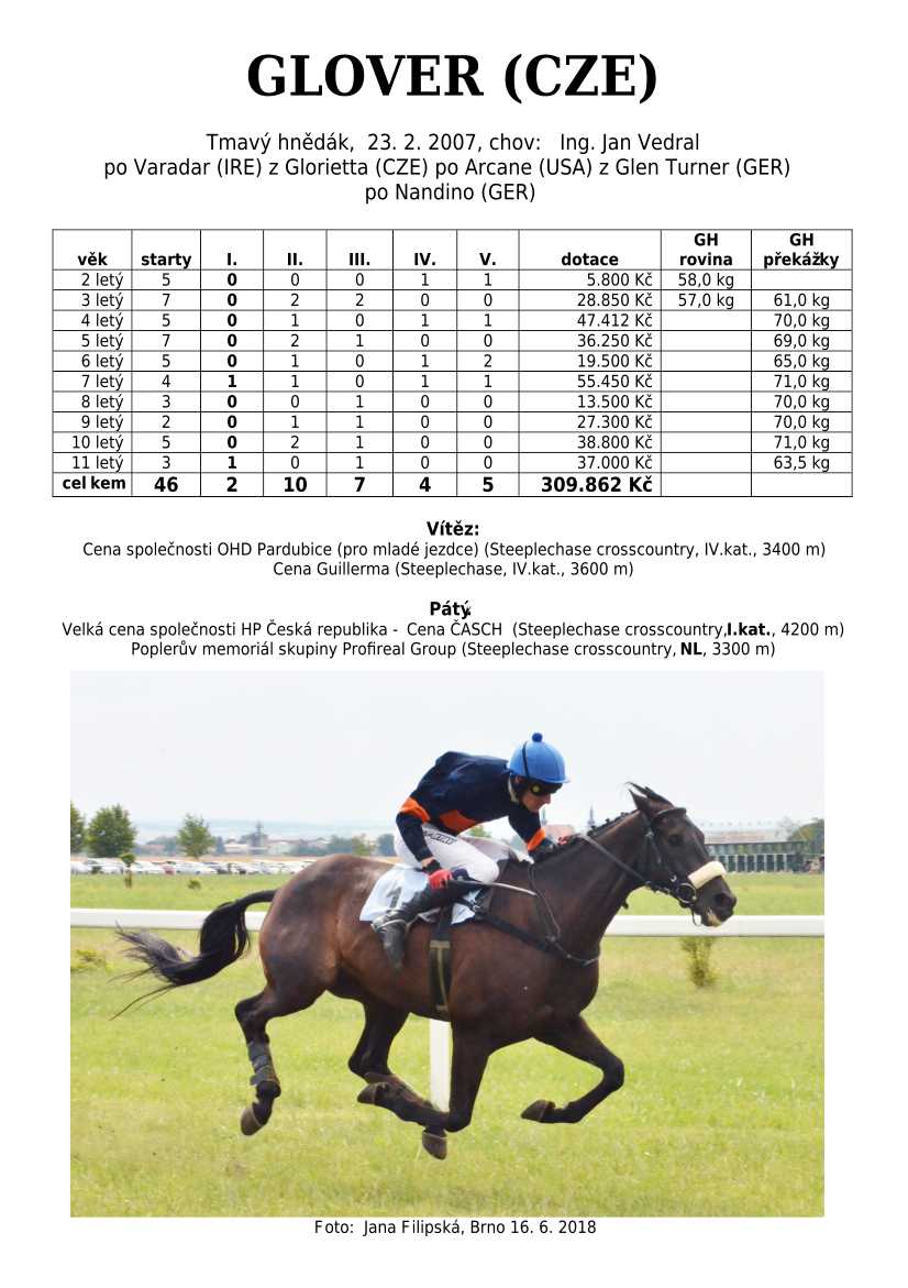 Bezpochyby největší zásluhu na titulu má náš nejvěhlasnější překážkový dostih Velká pardubická steeplechase. Letošní ročník se do historie zapsal zcela nezapomenutelně. Především to byl fantastický doběh dvou koní současně. Sice chyběla cílová fotografie, ale mě strhující výkon obou koní, po 6900 m dlouhé trati, vzal dech a dostihová komise nemohla rozhodnout o vítězství lépe. Poctivý SEXY LORD (Egerton) a jako z praku vystřelený do posledních metrů polokrevný GODFREY(FR)(Great Pretender). Přispěním do šampionátu byla i pátá příčka matadora TALENTa (Egerton). Pár bodíků přidali i umístění v rámcový dostizích ASKERANA (Egerton) a CLAUDIO (Egerton).