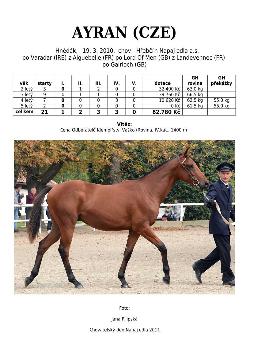 Jak je vidět, excelovali potomci již nežijících plemeníků a EGERTON opět sahá po titulu šampiona plemeníků. Všem gatuluji k úspěchům a hlavně děkuji českým chovatelům, že v této nelehké době zachraňují střípky chovu. Klesající počty chovných klisen hovoří bohužel jasnou řečí.