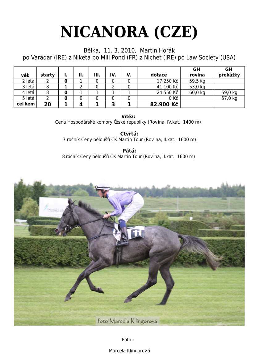 Hnědka BATHORY (IRE) (Celtic Swing) na dráze startovala 3-4 letá celkem 8x. Získala 2 vítězství, ale největším úspěchem bylo druhé místo v Cene Whisky (I.kat). Žádná super hvězda, ale ani se zcela neztratila.