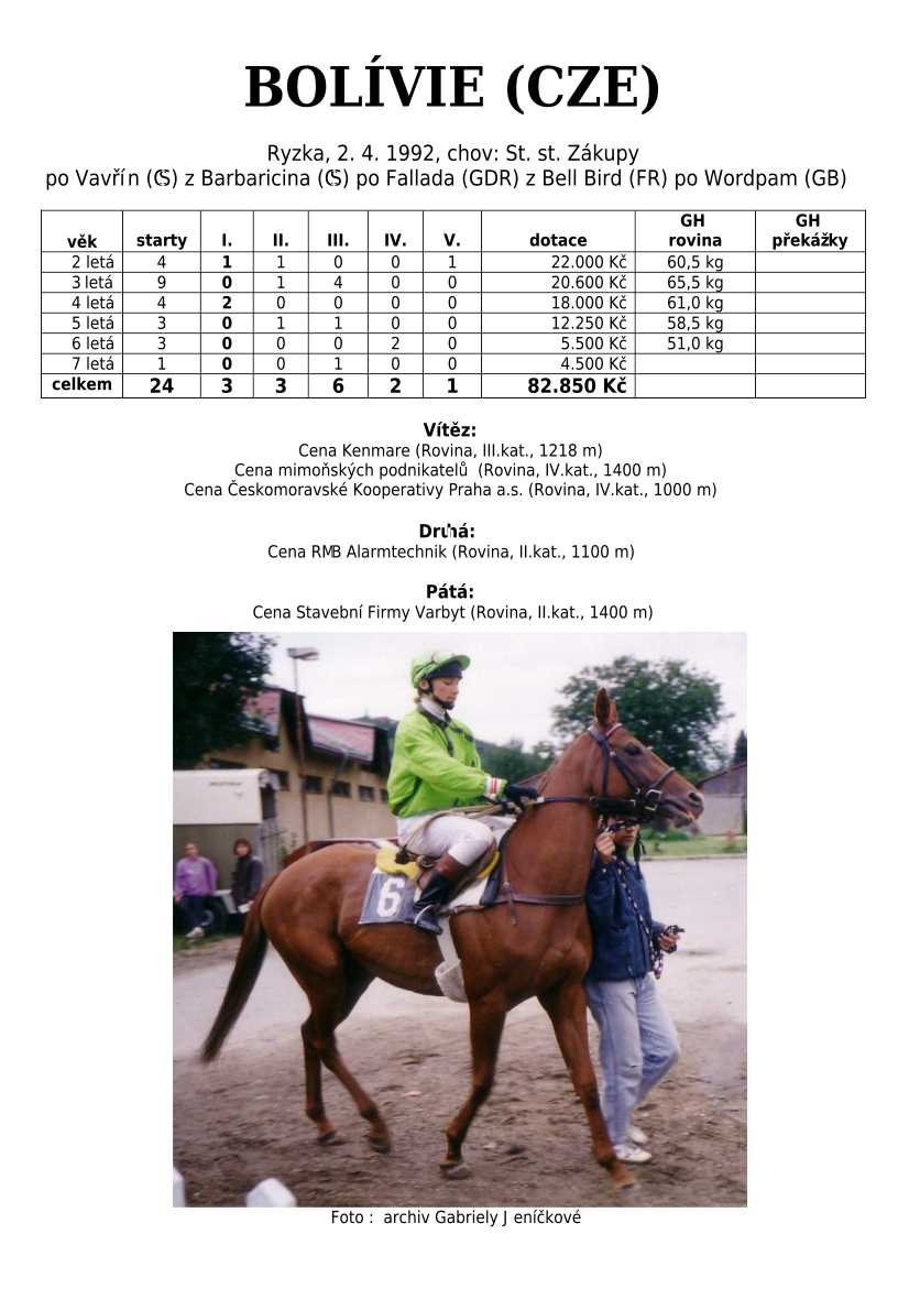 Hnědka BATHORY (IRE) (Celtic Swing) na dráze startovala 3-4 letá celkem 8x. Získala 2 vítězství, ale největším úspěchem bylo druhé místo v Cene Whisky (I.kat). Žádná super hvězda, ale ani se zcela neztratila.