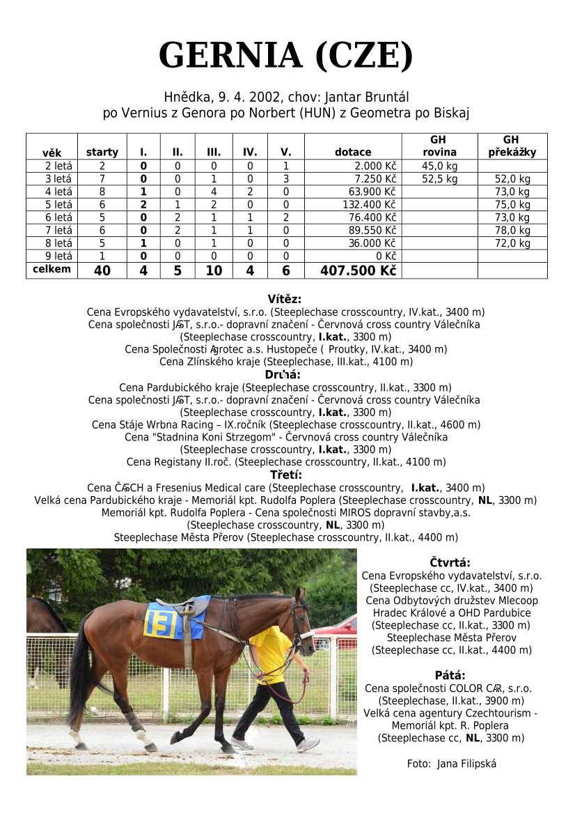 Bezpochyby největší zásluhu na titulu má náš nejvěhlasnější překážkový dostih Velká pardubická steeplechase. Letošní ročník se do historie zapsal zcela nezapomenutelně. Především to byl fantastický doběh dvou koní současně. Sice chyběla cílová fotografie, ale mě strhující výkon obou koní, po 6900 m dlouhé trati, vzal dech a dostihová komise nemohla rozhodnout o vítězství lépe. Poctivý SEXY LORD (Egerton) a jako z praku vystřelený do posledních metrů polokrevný GODFREY(FR)(Great Pretender). Přispěním do šampionátu byla i pátá příčka matadora TALENTa (Egerton). Pár bodíků přidali i umístění v rámcový dostizích ASKERANA (Egerton) a CLAUDIO (Egerton).