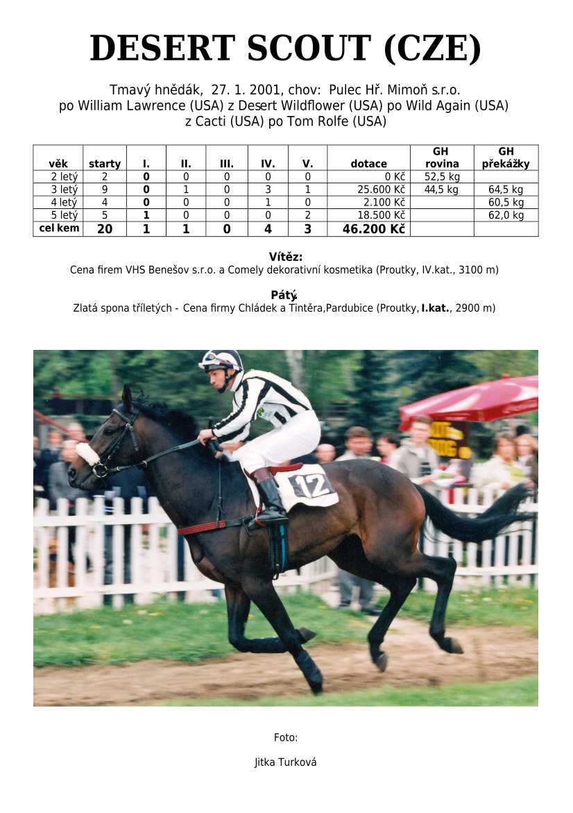 Bezpochyby největší zásluhu na titulu má náš nejvěhlasnější překážkový dostih Velká pardubická steeplechase. Letošní ročník se do historie zapsal zcela nezapomenutelně. Především to byl fantastický doběh dvou koní současně. Sice chyběla cílová fotografie, ale mě strhující výkon obou koní, po 6900 m dlouhé trati, vzal dech a dostihová komise nemohla rozhodnout o vítězství lépe. Poctivý SEXY LORD (Egerton) a jako z praku vystřelený do posledních metrů polokrevný GODFREY(FR)(Great Pretender). Přispěním do šampionátu byla i pátá příčka matadora TALENTa (Egerton). Pár bodíků přidali i umístění v rámcový dostizích ASKERANA (Egerton) a CLAUDIO (Egerton).