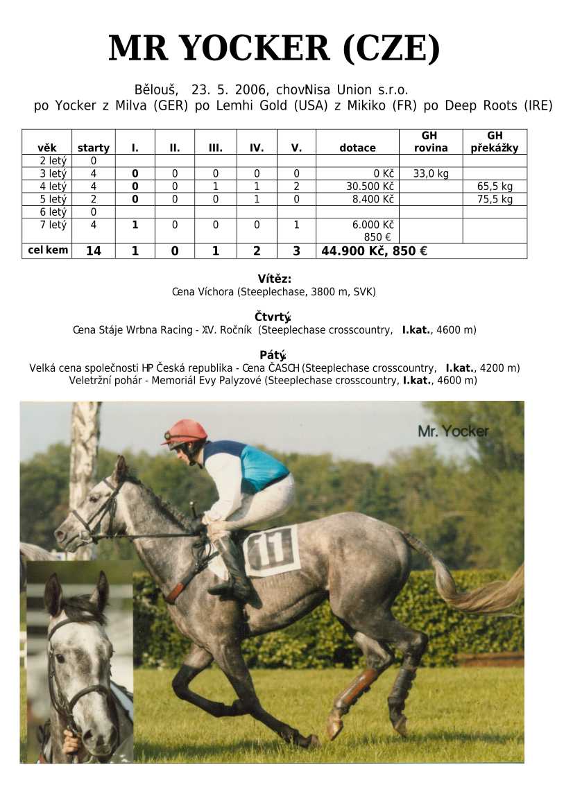 Bezpochyby největší zásluhu na titulu má náš nejvěhlasnější překážkový dostih Velká pardubická steeplechase. Letošní ročník se do historie zapsal zcela nezapomenutelně. Především to byl fantastický doběh dvou koní současně. Sice chyběla cílová fotografie, ale mě strhující výkon obou koní, po 6900 m dlouhé trati, vzal dech a dostihová komise nemohla rozhodnout o vítězství lépe. Poctivý SEXY LORD (Egerton) a jako z praku vystřelený do posledních metrů polokrevný GODFREY(FR)(Great Pretender). Přispěním do šampionátu byla i pátá příčka matadora TALENTa (Egerton). Pár bodíků přidali i umístění v rámcový dostizích ASKERANA (Egerton) a CLAUDIO (Egerton).